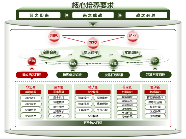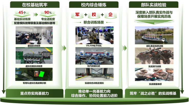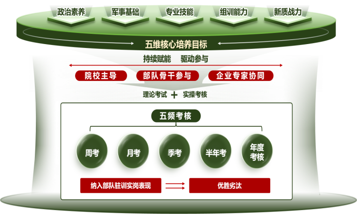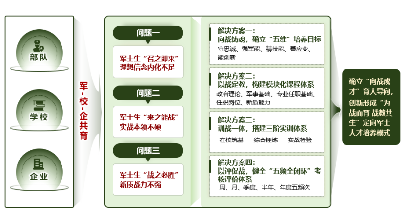 习近平总书记明确要求,培养面向战场、面向部队、面向未来的高素质军士人才,要做到“打仗需要什么就教什么、部队需要什么就练什么”,推进个性化精准培养。作为河南省首所定向培养军士院校,针对军士生培养中理想信念内化不足、实战本领不硬、新质战力不强等突出问题,自2015年启动紧贴部队需求的军士人才培养改革探索,以破解战教脱节、深化军校企协同为核心,确立“向战成才”育人导向,创新形成“为战而育 战教共生”定向军士人才培养模式,2020年全面实施,历经6年实践完善,育人成效显著。